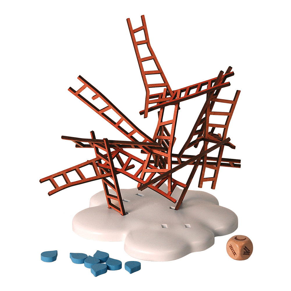 Climb up through the clouds and reach out for the moon! All it takes is a handful of cleverly placed ladders, an ever-steady hand, and a bit of imagination. Reach for the moon, but be careful to not stretch yourself too thin, or you may lose the supporting ladders under your feet. With the right mix of risk-taking and suspense, you will climb to success. In this stacking/dexterity game with a whimsical, ethereal theme and beautiful design, players take turns rolling one die to determine how they must place their wooden ladders (it must touch one other ladder, two other ladders, or be the highest point in the stack). Ladders will shift as more of them are added, adding an element of suspense and unpredictability. Raindrops are given to players whose ladders cause a collapse of the structure; the winner is the player with the least amount of raindrops at game's end!