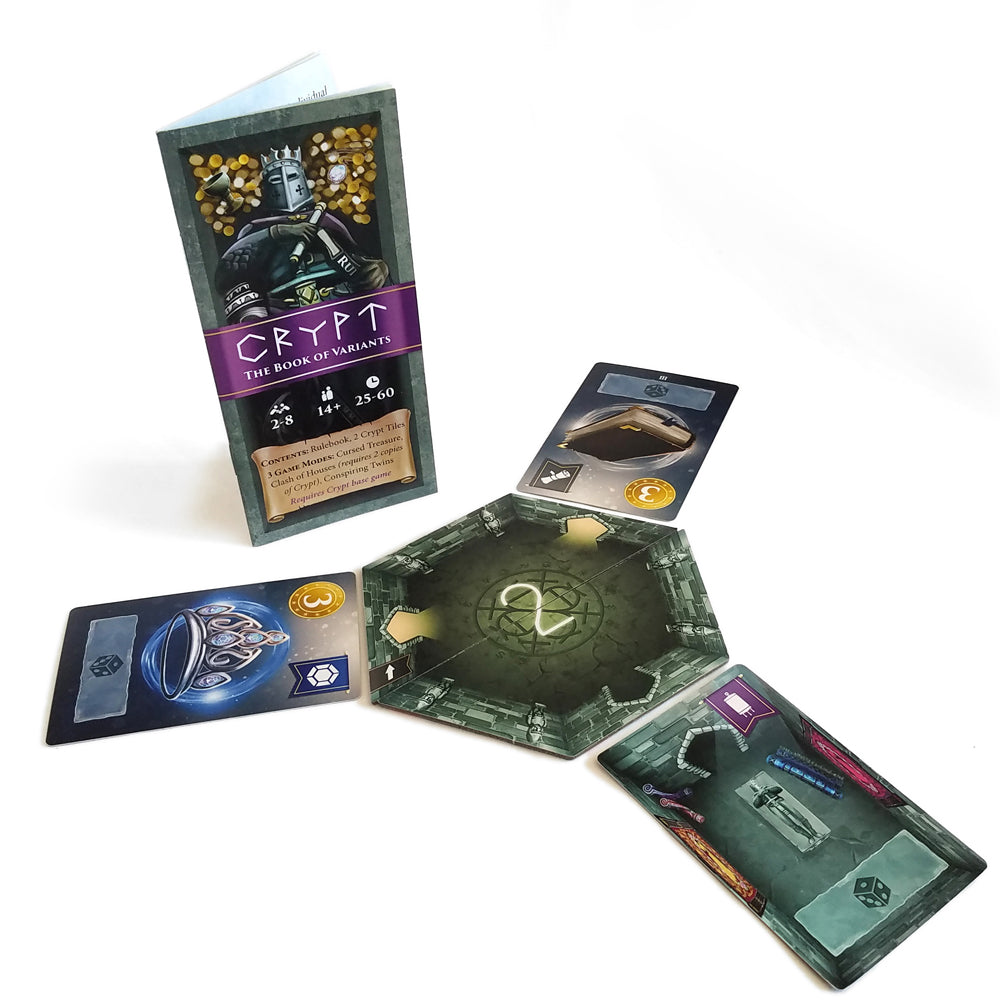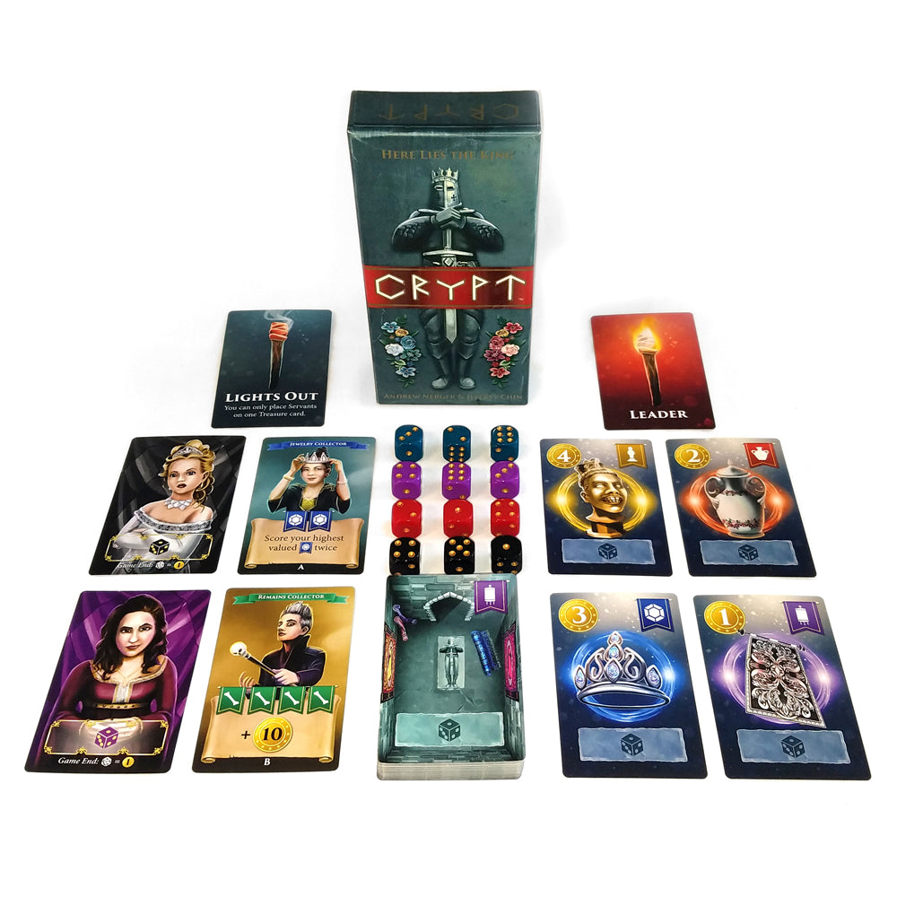 In Crypt, players will send their loyal servants into the crypt chambers to take back the family's valued treasure. Claim Treasure cards by placing Servant dice by choosing any value on each die to represent each Servant’s effort. The higher the value, the greater the chance your Servant will become exhausted when you roll the dice. You can also elbow out your siblings’ Servants by placing dice with values exceeding the occupying Servants’ total effort. When the game ends, players will add the value of their treasure plus any bonus points from selling sets to Collectors. The player who has the most valuable collection wins!