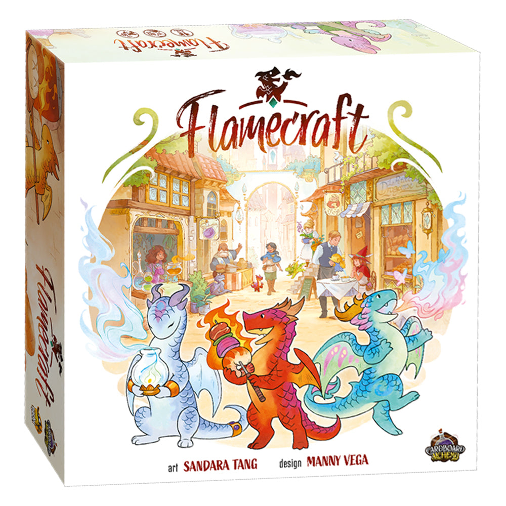 In Flamecraft, up to 5 players take on the role of Flamekeepers, gathering items, placing dragons and casting enchantments to enhance the shops of the town. Dragons are specialized (bread, iron, meat, crystal, plant and potion) and the Flamekeepers know which shops are the best home for each. Visit shops to get items and a favor from one of the dragons there. Gathered items may be used to enchant a shop, gaining reputation and the favors of all the dragons in the shop. If you are fortunate enough to attract fancy dragons then you will have chances to secure even more reputation.