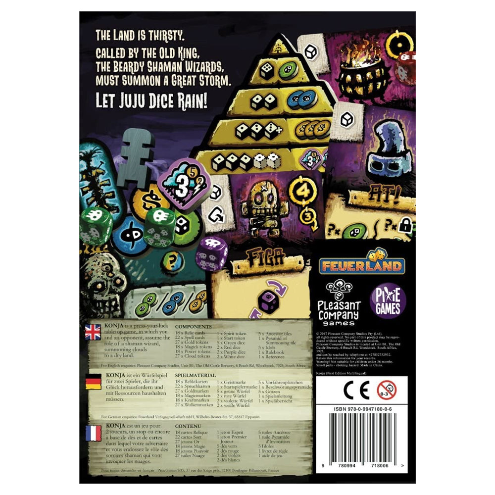 Konja is a press-your-luck and resource management dice game where 2 players compete as wizards, summoned by an old king to manifest a great storm and bring rain to a dry land. By rolling dice and activating powerful spells and relics cards, players get Gold, Magick, Power, and Clouds.