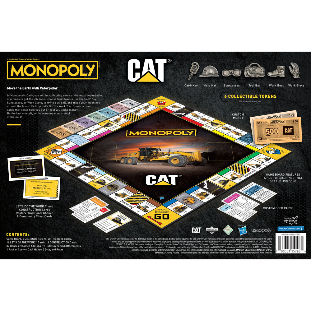 In Monopoly®: CAT®, you'll be collecting some of the most dependable machines to get the job done. Pick from tokens like the Cat® Key, Sunglasses, or Work Glove, to try to buy, sell, and trade your machines around the board. Pick up Let’s Do The Work.™ or Construction cards that could help you out or cost you some money. Be the last one left, while the other players are stuck in the mud!